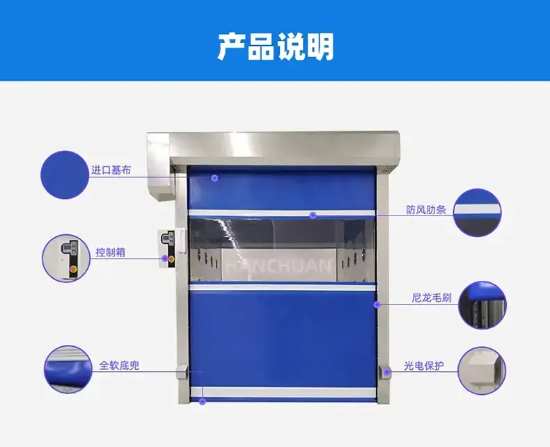 不同行业对 PVC 快速卷帘门的需求差异,瀚川也做了针对性适配。制药 GMP 车间对密封和洁净度要求高,瀚川定制款可加装防尘刷、底部气囊加强密封,杜绝气流夹带粉尘进入 A 级 / B 级洁净区;电子车间对防静电要求高,帘布可定制防静电涂层,避免静电吸附粉尘影响产品精度;食品加工车间对卫生要求高,PVC 帘布可选用食品级材质,易清洁、无异味,符合食品生产卫生规范。